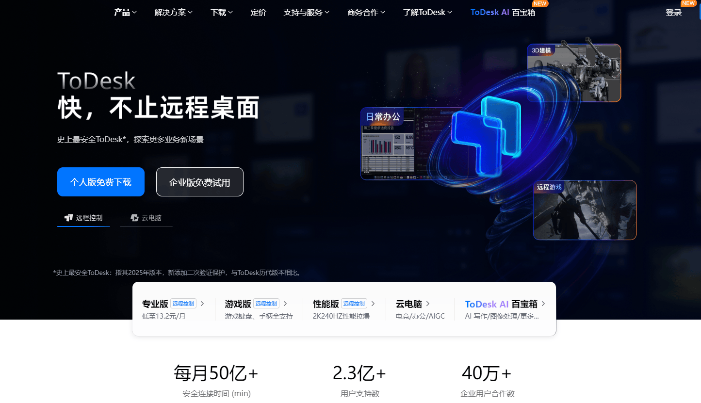 如今,ToDesk已经发展出远程控制个人版、远程控制企业版、渲骋云渲染平台等多条核心产品线,共同构成一个完整的远程办公娱乐生态系统。
