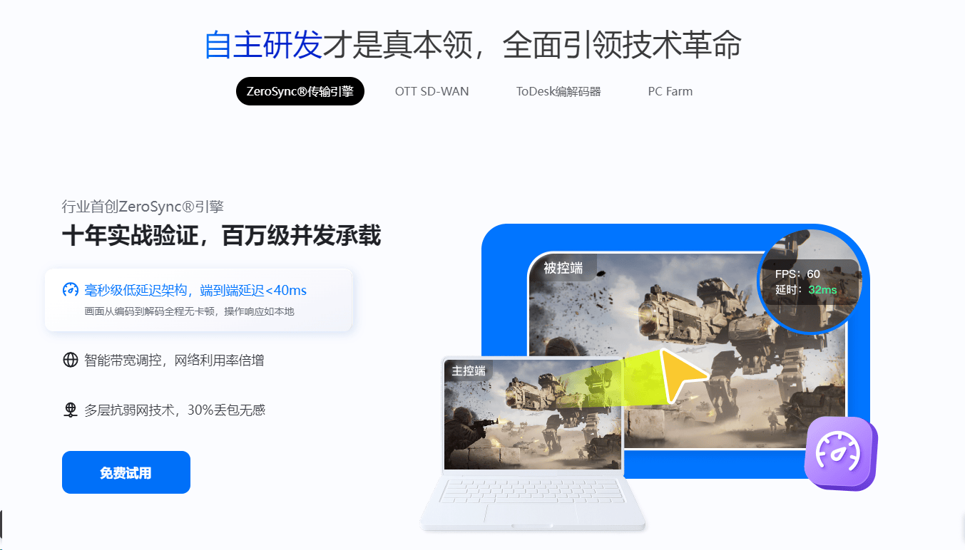 ToDesk凭借三重核心技术,构筑了流畅远程体验的夯实基础;这三大技术分别是ZeroSync®传输引擎、音视频编解码器以及OTT SD-WAN智能网络优化技术。