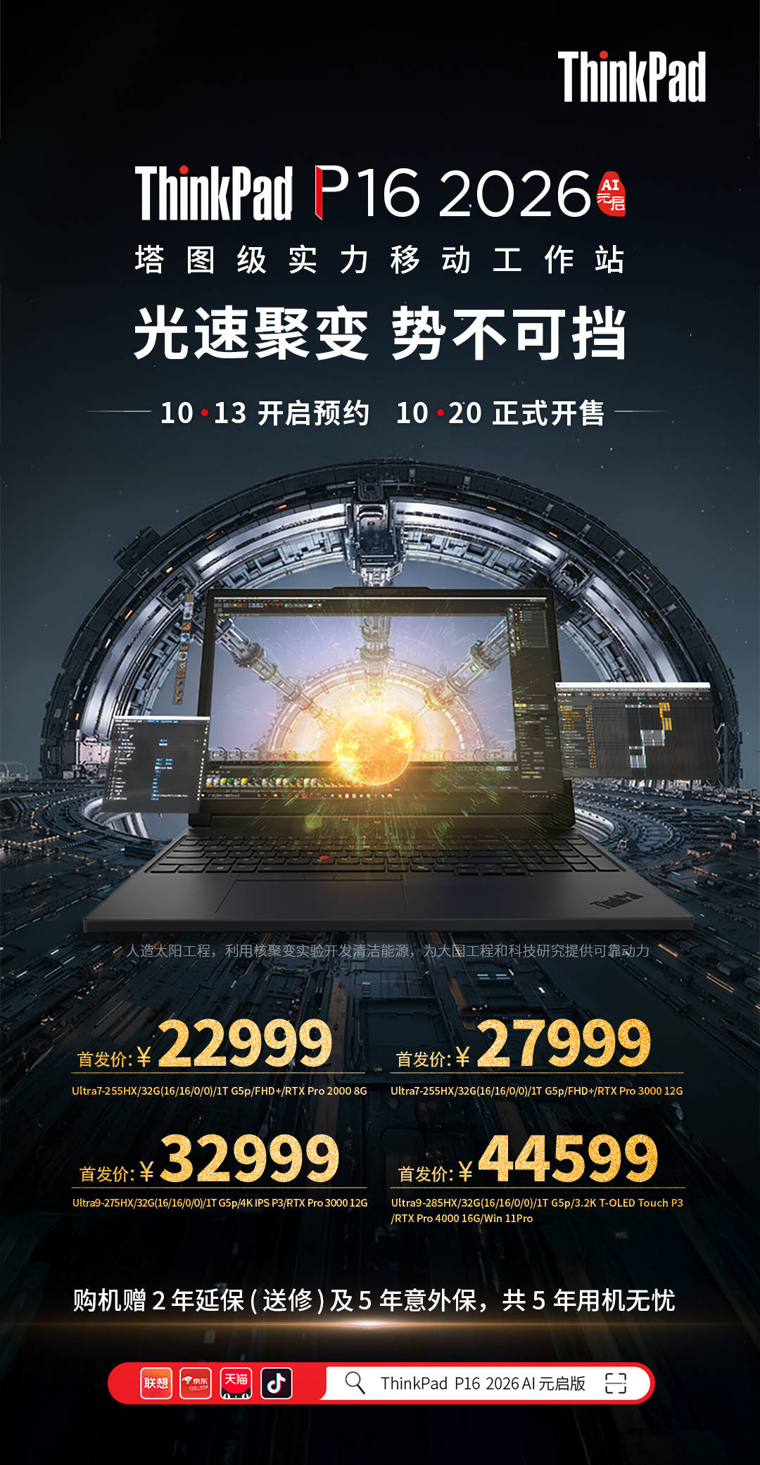 ThinkPad P16 2026 AI元启版现已在联想官网、ThinkPad京东官方旗舰店、ThinkPad天猫官方旗舰店、ThinkPad抖音官方旗舰店正式开售,赠送2年联保及5年意外保。作为当前市场上性能最强劲的移动工作站,ThinkPad P16 2026 AI元启版让用户无论是从事复杂工程设计、高端影视制作还是数据工程计算,都能获得专业、可靠的高效工作体验。