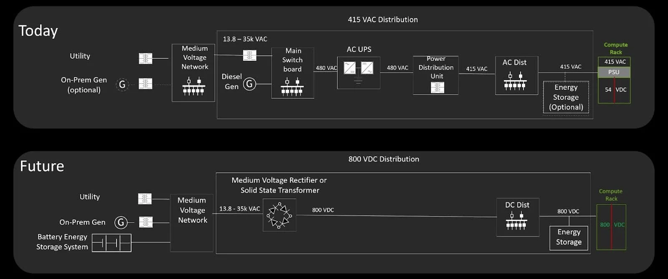 图1:英伟达从415伏交流(上)到800伏直流(下)的配电架构演进