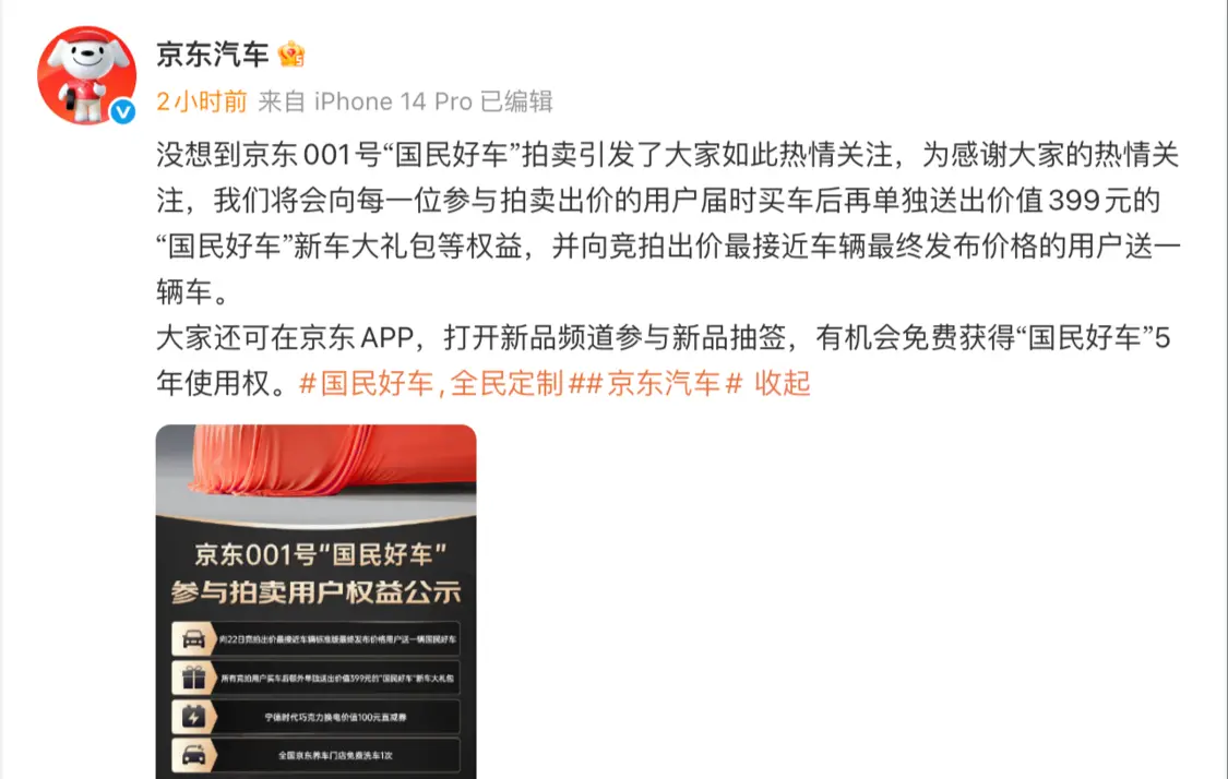 今日,京东汽车官方发布消息称:没想到京东001号“国民好车”拍卖引发了大家如此热情关注,为感谢大家的热情关注,我们将会向每一位参与拍卖出价的用户届时买车后再单独送出价值399元的“国民好车”新车大礼包等权益;