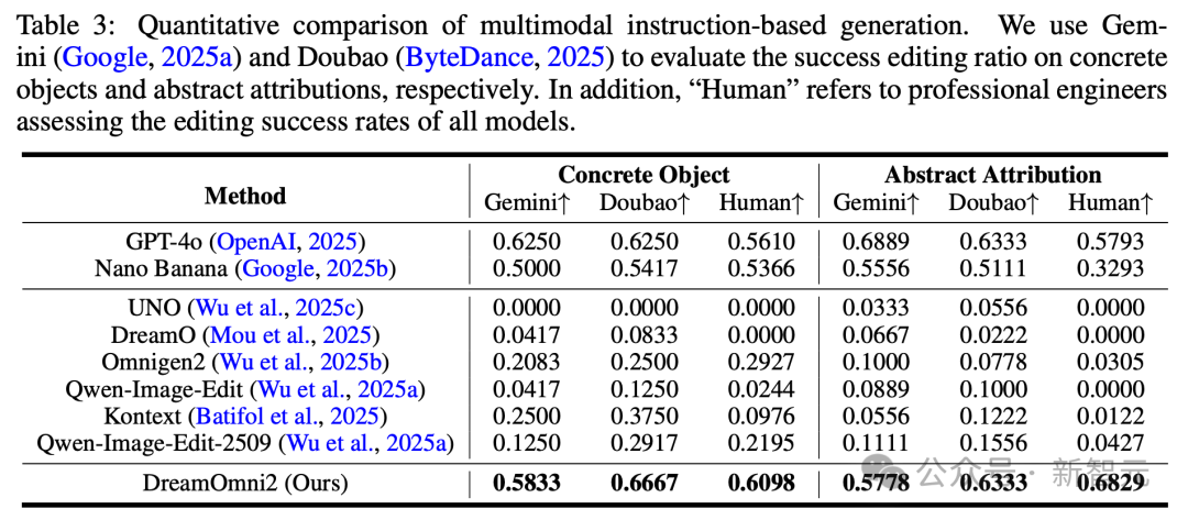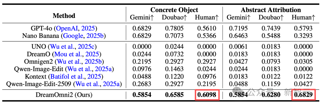 DreamOmni2在「具体物体」和「抽象属性」上的得分都是最高的,一些方面超过了GPT-4o和Nano Banana。