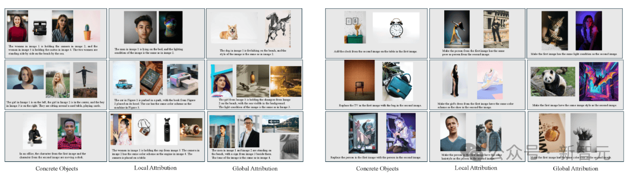 通过这个三阶段流水线,团队成功构建了一个多样化、高质量的综合数据集,涵盖了对具体物体和抽象属性(如局部和全局属性)的生成和编辑,并且支持多个参考图像输入。