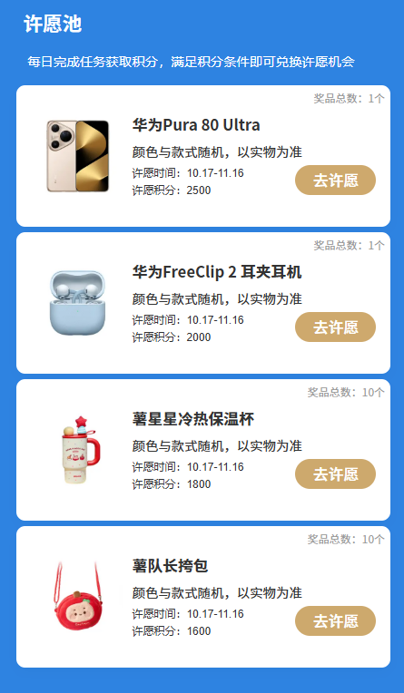 • 打卡做任务,许愿赢好礼:完成每日任务赚积分,攒够积分即可参与“许愿池”抽奖,就有概率赢华为旗舰手机、耳机、小红书定制周边等惊喜好礼!