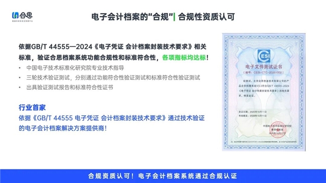当行业仍在探索合规落地路径时,合思档案已率先通过了《GB/T 44555电子凭证 会计档案封装技术要求》国家标准符合性认证,成为中国电子技术标准化研究院(CESI)认证的行业首家解决方案提供商,为企业电子会计档案管理搭建起 “电子凭证全链路合规屏障”。