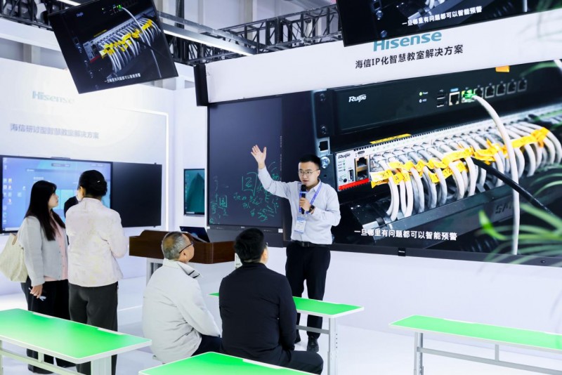 传统智慧教室普遍面临设备叠加导致的高成本、系统复杂难管理、多品牌割裂体验差、维护困难等四大痛点。海信商用显示精准切入行业需求,展出IP化智慧教室解决方案,通过IP化架构重构实现硬件集约化——仅需两台核心设备即可满足教学全流程需求。该方案成效显著:建设成本降低40%,部署成本下降60%;依托全链路可视化运维体系,系统故障率下降60%,运维效率提升60%。