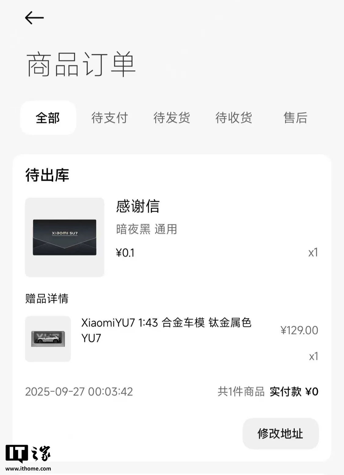 “Xiaomi YU7 锁单等待用户关怀活动”曾送出的第一件“小礼品”曾送出的是一款小米 YU7 的 1:43 合金车模,价值 129 元。