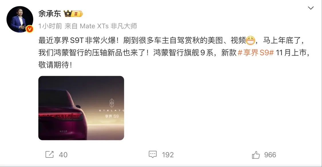 10月27日,华为常务董事、终端BG董事长余承东发文宣布:鸿蒙智行的“压轴新品”新款享界S9将于11月上市。