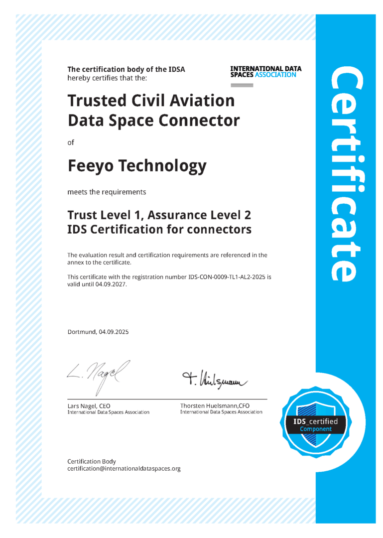 近日,飞友科技民航可信数据空间连接器(TCADSC)在下一代互联网国家工程中心-IDS数据空间测试认证实验室顺利通过评估,获得了由国际数据空间协会(IDSA)颁发的国际数据空间(IDS)组件认证。该成果标志着产品在技术合规性、安全性与国际互操作性上符合了国际要求,实现了与国际数据空间标准的全面对齐,同时还为国内数据空间生态的标准化建设提供了关键实践标杆。