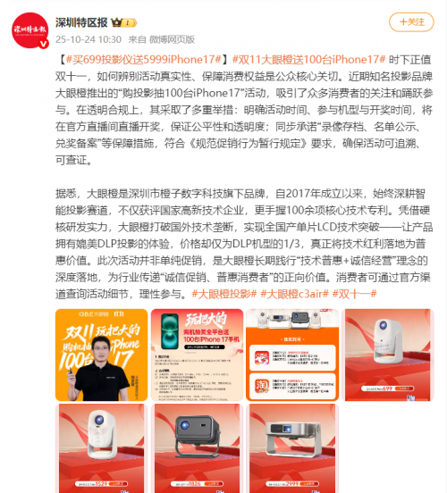 作为此次活动的关键信任支撑,《深圳特区报》通过官方微博发布报道,直接为活动真实性 “盖章”。其微博内容明确指出,大眼橙“购投影抽100台 iPhone17”活动并非噱头,而是通过“明确活动时间、参与机型与开奖时间”、“直播间直播开奖”、“录像存档、名单公示、兑奖备案”等多重举措,确保活动全程可追溯、可查证。作为深圳本地权威媒体,《深圳特区报》的报道不仅让消费者看到了活动的合规性,更从官方视角印证了大眼橙作为本土科技企业的诚信底色,有效消解了大众对“大促福利掺水”的固有疑虑。