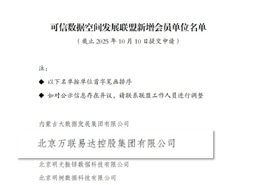 值得一提的是,为落实《可信数据空间发展行动计划(2024-2028年)》,万联易达集团基于产业AI+多维度可信数据空间的发展模式,已获批成为可信数据空间发展联盟成员单位。