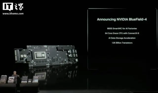 IT之家注意到,英伟达尚未披露 BlueField-4 DPU 完整的规格参数,但已确认新款 NVIDIA BlueField-4 DPU 集成了高达 1260 亿个晶体管,并将搭配 NVIDIA ConnectX-9 网络技术,全面支持 800G 网络连接能力。