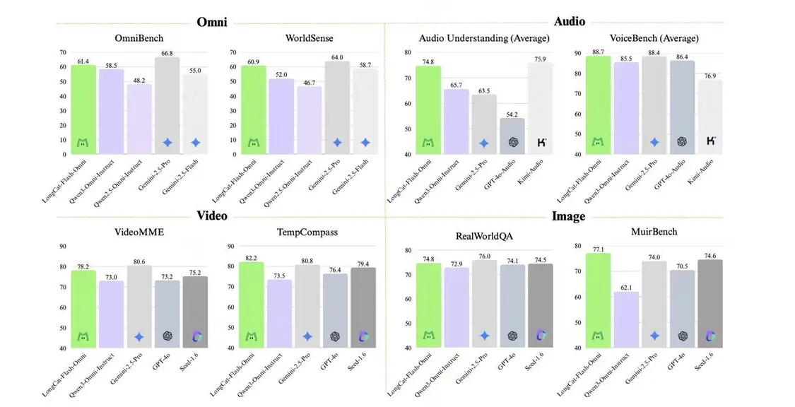 综合评估结果表明,LongCat-Flash-Omni 在全模态基准测试中达到开源最先进水平(SOTA),同时在文本、图像、视频理解及语音感知与生成等关键单模态任务中,均展现出极强的竞争力。LongCat-Flash-Omni 是业界首个实现 “全模态覆盖、端到端架构、大参数量高效推理” 于一体的开源大语言模型,首次在开源范畴内实现了全模态能力对闭源模型的对标,并凭借创新的架构设计与工程优化,让大参数模型在多模态任务中也能实现毫秒级响应,解决了行业内推理延迟的痛点。
