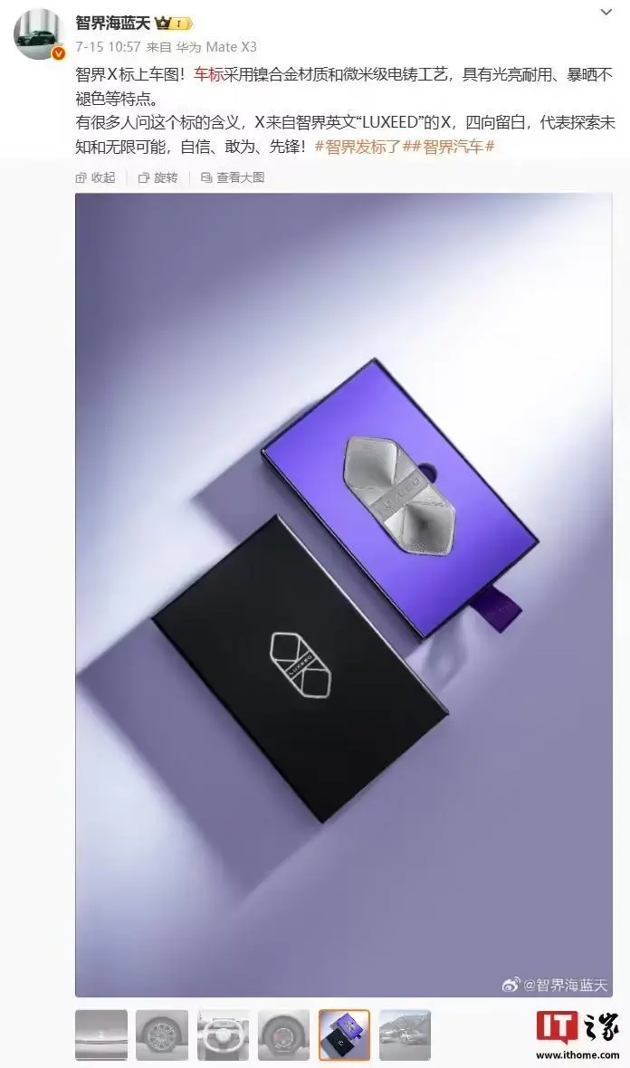 据IT之家此前报道,鸿蒙智行智界汽车 X 车标在今年 7 月 15 日焕新亮相。同时,智界汽车的官方微博借此机会更换了车标 LOGO 头像,补齐了鸿蒙智行的“最后拼图”。鸿蒙智行官方也同步开启了智界品牌标识纪念品免费赠送活动:R7 / S7 全体车主 7 月 27 日起分批次领取。