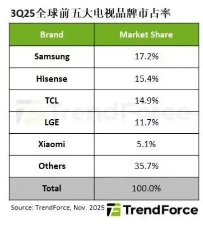 全球前五大电视品牌依序为 Samsung(三星)、Hisense(海信)、TCL、LGE 与 Xiaomi(小米),合计市占率达 64.3%。其中海信下半年起由守转攻,内外销皆以低价抢市,成功推升第三季出货量达 766 万台、环比增长 9.7%,重回全球第二,市占率也提升至 15.4%,创历年同期新高。