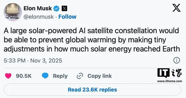 11 月 4 日消息,马斯克在 X 平台发表言论,针对全球变暖问题提出“太阳辐射管理”(Solar Radiation Management)这一工程概念,也就是在地球外层部署大量卫星集群,在轨道上将阳光反射回太空,使其无法直接照射地表,从而降低地球温度,这一设想被称为“基于太空的太阳辐射管理”(space-based SRM),在轨道上将阳光反射回太空。