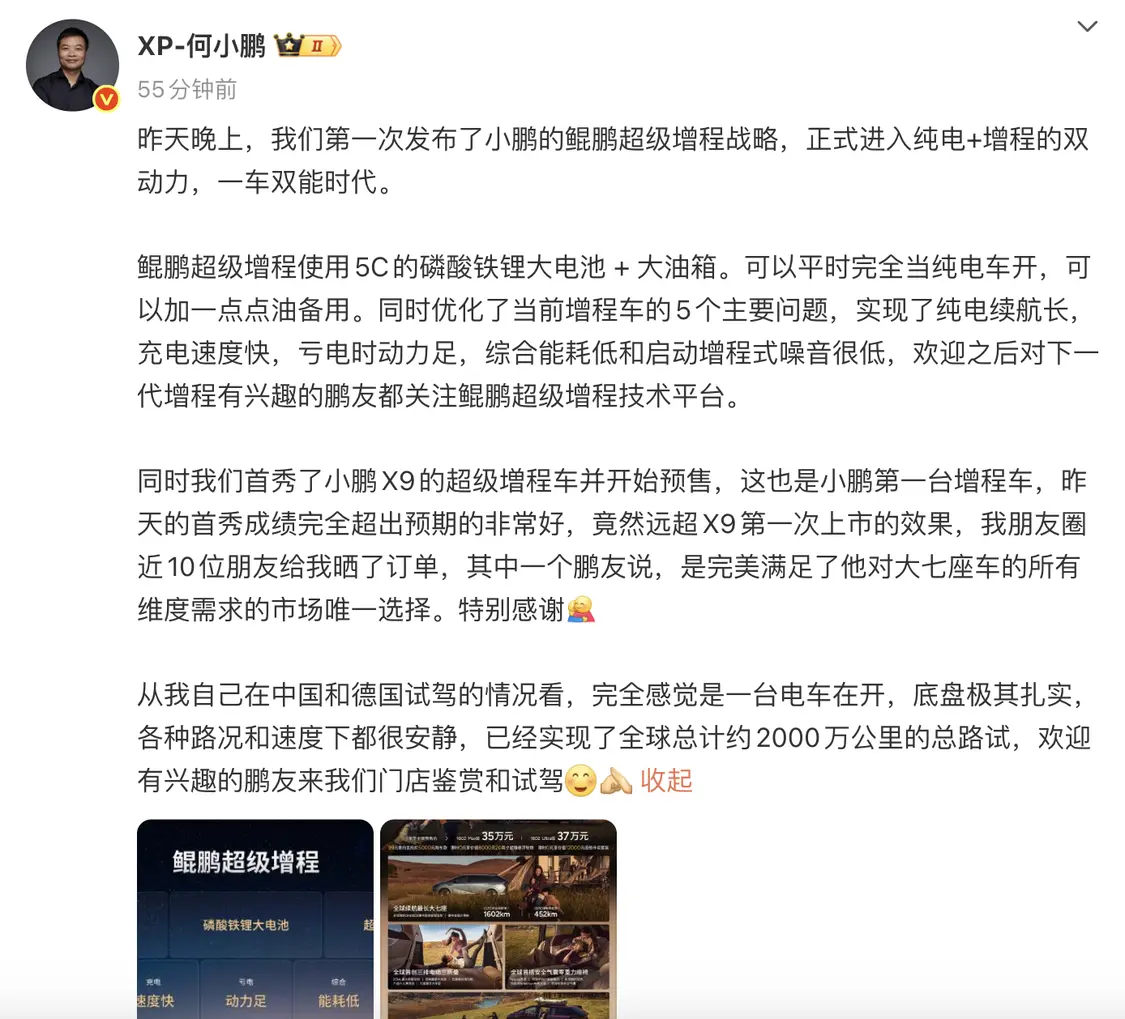 11月7日,小鹏汽车董事长何小鹏发文称,昨天晚上,我们第一次发布了小鹏的鲲鹏超级增程战略,正式进入纯电+增程的双动力,一车双能时代。