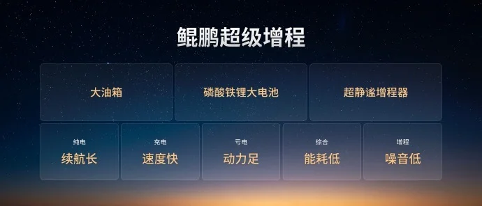 何小鹏介绍,鲲鹏超级增程使用5C的磷酸铁锂大电池+大油箱,平时可以当纯电车开,并优化了当前增程车的5个主要问题,实现了纯电续航长,充电速度快,亏电时动力足,综合能耗低和启动增程式噪音低。