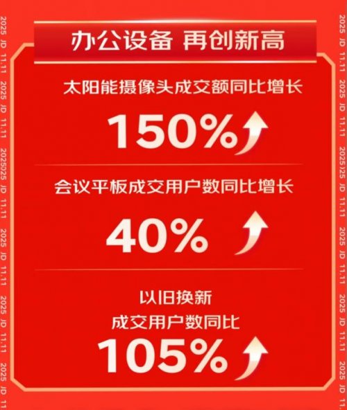 京东11.11期间,办公安防品类的销售表现十分亮眼。其中,太阳能摄像头成交额同比增长150%,会议平板成交用户数同比增长40%,以旧换新成交用户数同比增长105%。
