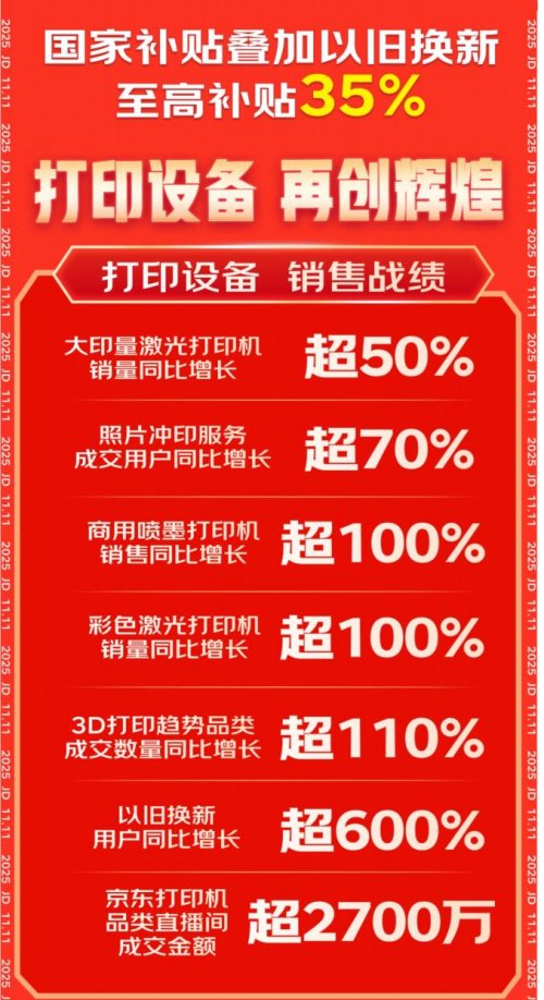京东11.11打印设备享国家补贴叠加以旧换新至高补贴35%,助推打印设备销售再创新高。大印量激光打印机成交量同比增长超50%;照片冲印服务成交用户同比增长超70%;商用喷墨打印机成交额同比增长超100%;彩色激光打印机成交量同比增长超100%;3D打印趋势产品成交量同比增长超110%;以旧换新用户同比增长超6倍。