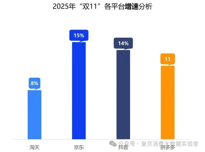 今年双11全网零售额实现双位数增长,背后是头部平台的差异化竞争与份额调整。从销售额占比来看,天猫淘宝以37%的份额保持领先,京东占比25%且持续上升,抖音与拼多多分别以15%和9%的占比居第二梯队,其他平台合计占比14%。增速方面,头部平台均实现同比正增长,其中京东在3C 数码、家电等 “带电” 品类继续保持优势,并在服饰品类实现快速增长,总体增速达到15%,行业最高。