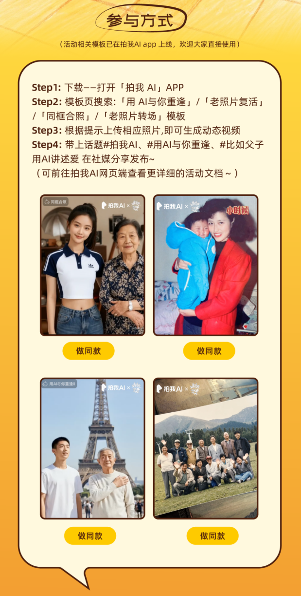 优秀作品将有机会获得电影票、拍我AI会员,并有望入选影片官方纪念短片,于全国路演大银幕呈现。拍我AI希望通过这场全民情感行动,让科技不止是工具,更成为表达情绪、修补遗憾的一种“新的叙述方式”。