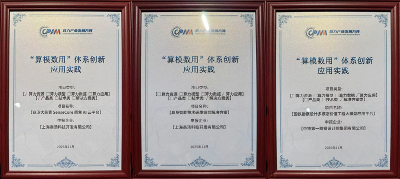 会上,商汤大装置SenseCore原生AI云平台、具身智能综合解决方案,以及由铁一院与商汤科技联合打造的国铁勘察设计多模态价值工程大模型应用平台三大创新实践,共同获评由信通院算力产业发展方阵评选并颁发的“算模数用”体系创新应用实践案例。