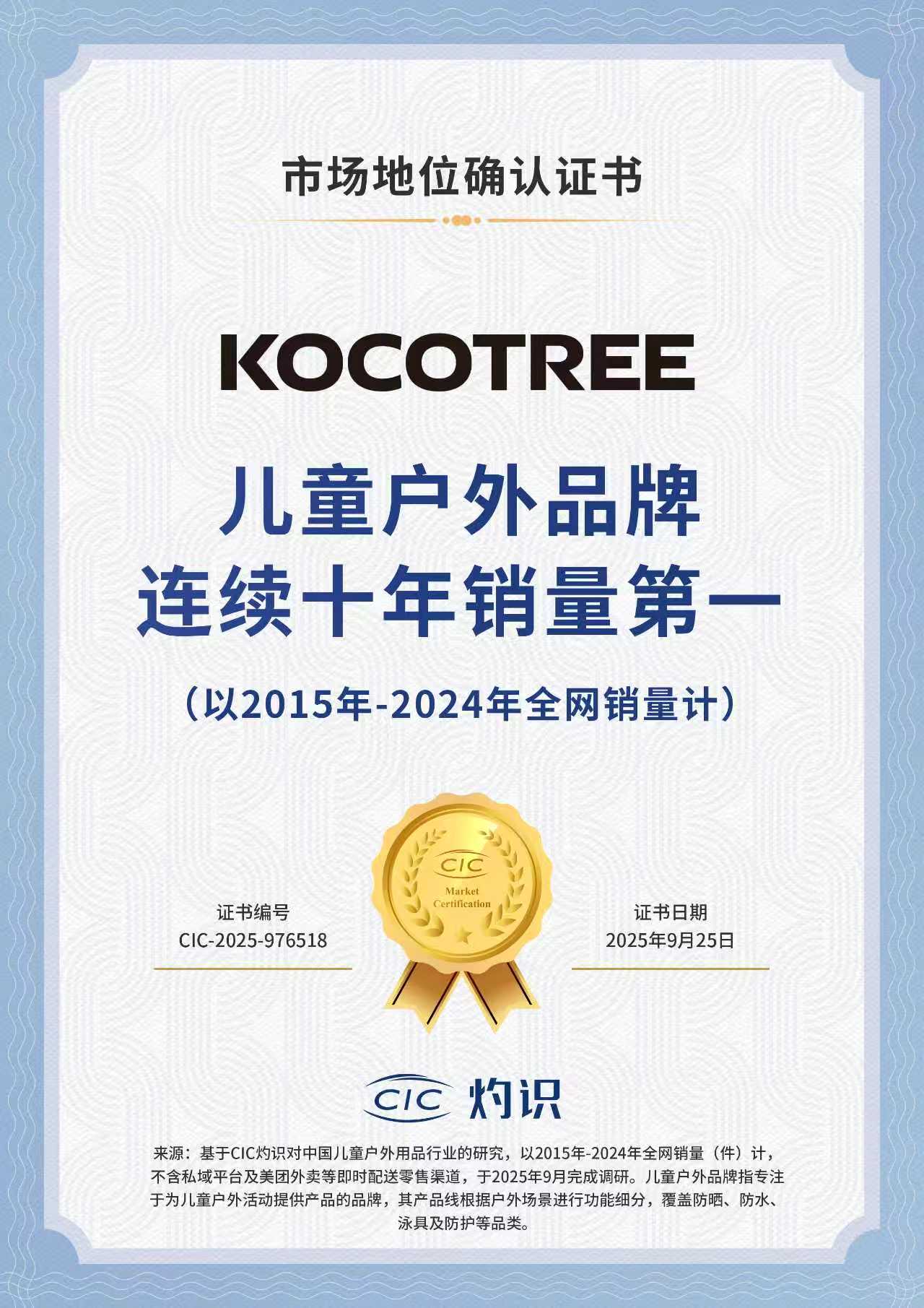 近日,KOCOTREE获得由国际权威咨询机构CIC灼识授予的“儿童户外品牌连续十年销量第一(以2015年-2024年全网销量计)”市场地位确认证书!