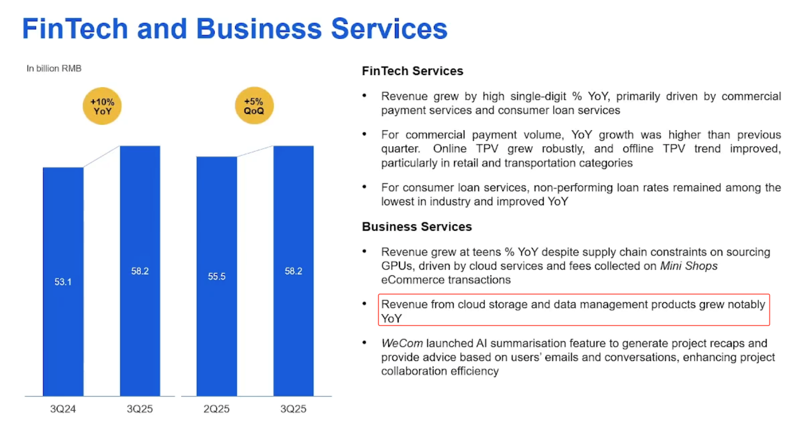近日,腾讯发布2025年第三季度财报,多元业务的健康增长驱动了财务表现,金融科技及企业服务业务收入581.7亿元,同比增长10%!