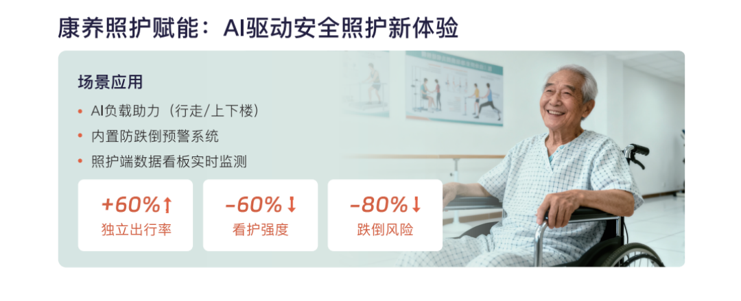 在出行场景中,AI负载技术为老人行走、上下楼提供智能力学支撑,让行动不便的老人重拾“行走自由”;在照护场景中,AI防跌倒预警系统24小时监测风险,同时为照护团队提供全局数据看板,实现“风险预判+资源优化”的主动照护模式。