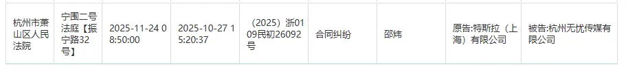 11 月 17 日消息,浙江法院网显示,特斯拉(上海)有限公司、杭州无忧传媒有限公司新增一则开庭公告,原告为特斯拉(上海)有限公司,案由为合同纠纷,该案将于 11 月 24 日在杭州市萧山区人民法院开庭审理。