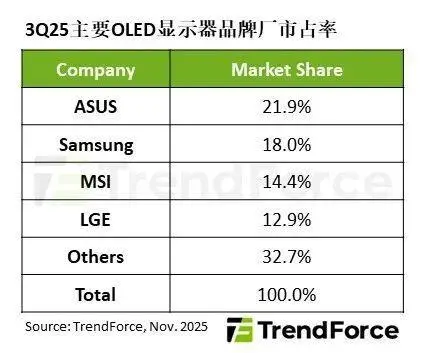 TrendForce 集邦咨询表示,第三季度 OLED 显示器出货前两名顺序翻转,ASUS 市占率上升至 21.9%,首度拿下 OLED 显示器单季出货第一名。ASUS 产品线布局完整,除了广受好评的 ROG 电竞显示器外,亦率先推出针对创作者的 ProArt 专业 OLED 系列,以及多款创新的携带型(Portable Monitor)与折叠双屏幕显示器,满足消费者不同需求。完整的产品策略与持续创新,巩固了华硕在中高端市场的专业形象,预估其 2025 全年 OLED 显示器出货也将登上全球第一。