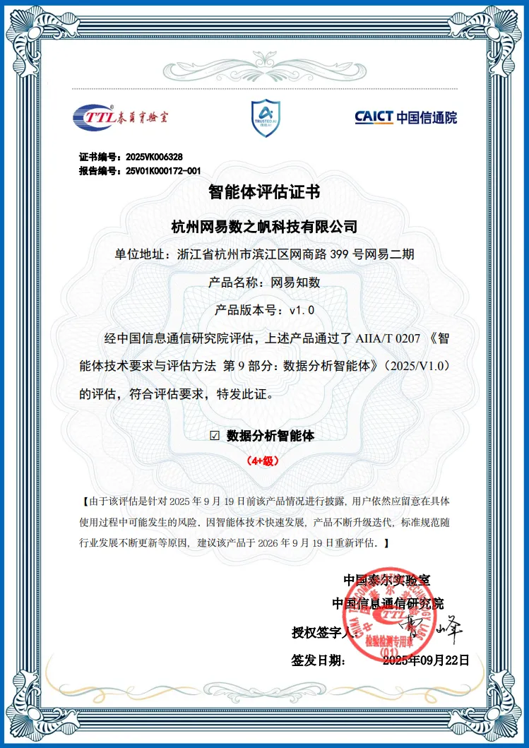 封雷表示,在今天网易知数正式发布之前,这款产品就已经经历了层层严苛的考验。前不久,中国信通院依据《智能体技术要求与评估方法 第9部分:数据分析智能体》,围绕智能体技术能力、场景能力和服务成熟度三大维度对网易知数进行了细致全面的评估,最终网易知数通过了中国信通院可信 AI 智能体评估。