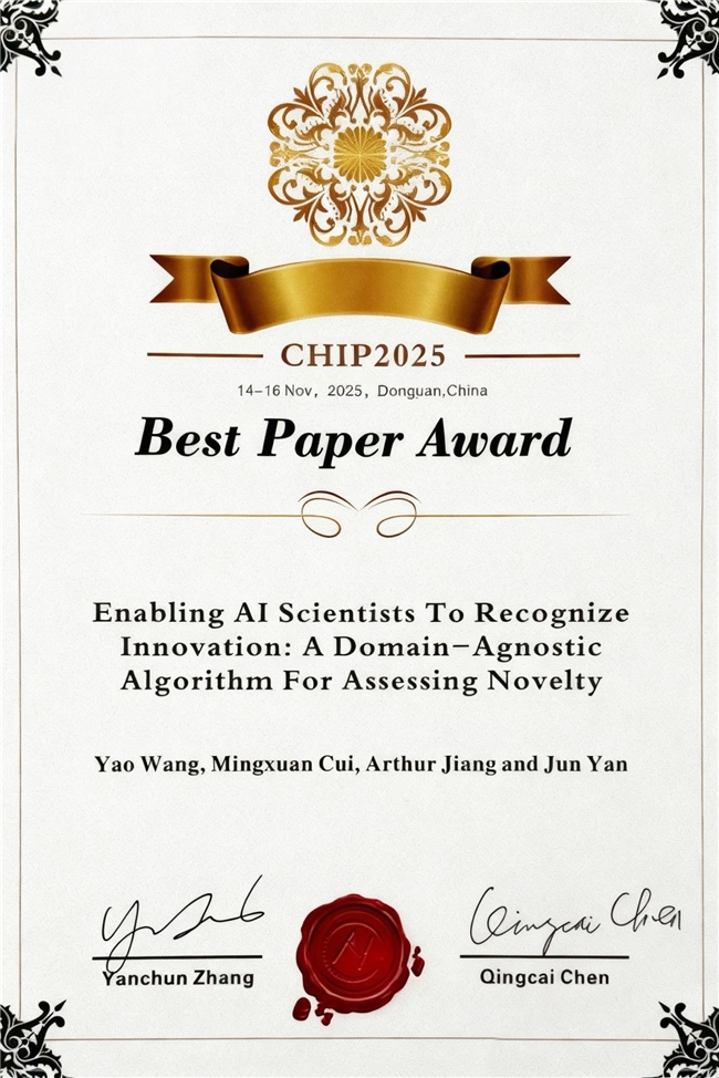 除技术实践外,医渡科技的学术创新能力同样获得认可。医渡科技首席人工智能科学家闫峻博士团队的研究论文《Enabling AI Scientists To Recognize Innovation: A Domain-Agnostic Algorithm For Assessing Novelty》荣膺本届大会“最佳论文奖”。