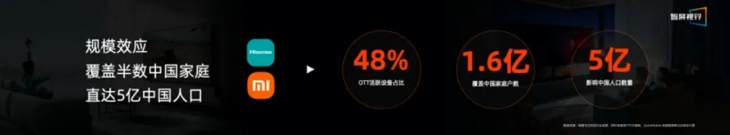 平台整合小米电视、海信电视两大头部品牌,覆盖中国48%的OTT活跃设备、1.6亿家庭用户,影响超5亿人口。这意味着品牌可通过统一入口实现对广泛家庭覆盖与深度沟通,构建 “家庭共识营销”新场域。