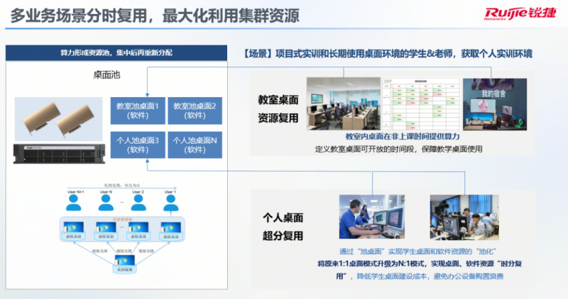 锐捷一朵云2.0方案覆盖如教学桌面(如公共机房、专业机房)、算力AI桌面(如科研计算、AI应用)、办公桌面等十大应用场景。在专业机房场景中,平台可根据课程需求灵活分配GPU资源;在远程实训场景中,学生可随时随地登录专属桌面,延续实训数据。这些场景通过统一平台实现“不同终端类型融合、课堂教学与教师办公融合、桌面算力与AI应用融合”,有效解决了“忙时不够用、闲时不能用”的资源错配问题。