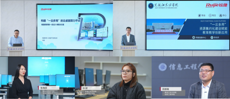 近日,锐捷网络与黑龙江东方学院联合举办“一云多用”线上研讨会,聚焦云桌面平台如何赋能教育多场景资源畅享。全国20余个分会场、逾300名教育界同仁齐聚云端,共探教育数字化发展。会上,锐捷网络系统阐释了“高校一朵云2.0”解决方案;黑龙江东方学院网络信息中心李兆祥主任应邀出席,分享了学校的“一云多用”建设经验,同时在会议过程中呈现了云桌面在机电工程学院、艺术设计学院与信息工程学院的真实应用成效。
