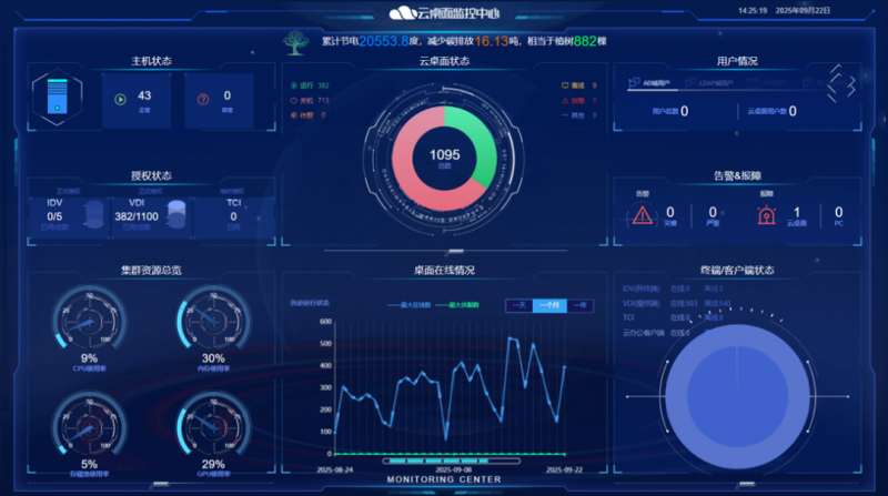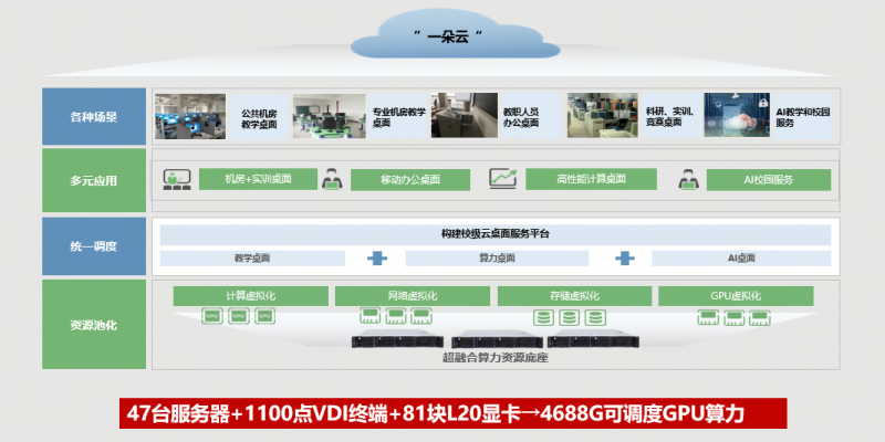 云桌面算力平台采用融合的桌面管理架构,将CPU、内存、GPU、存储等硬件资源池化,支持按需动态分配。例如,上课时段优先分配算力给教学桌面,夜间或假期则调度闲置资源给科研项目,实现“分时复用”。同时,平台支持跨品牌GPU统一管理,异构融合技术让不同显卡协同工作,既降低授权成本,又满足AI训练等高算力需求。充分体现了“一云多用”的灵活性。