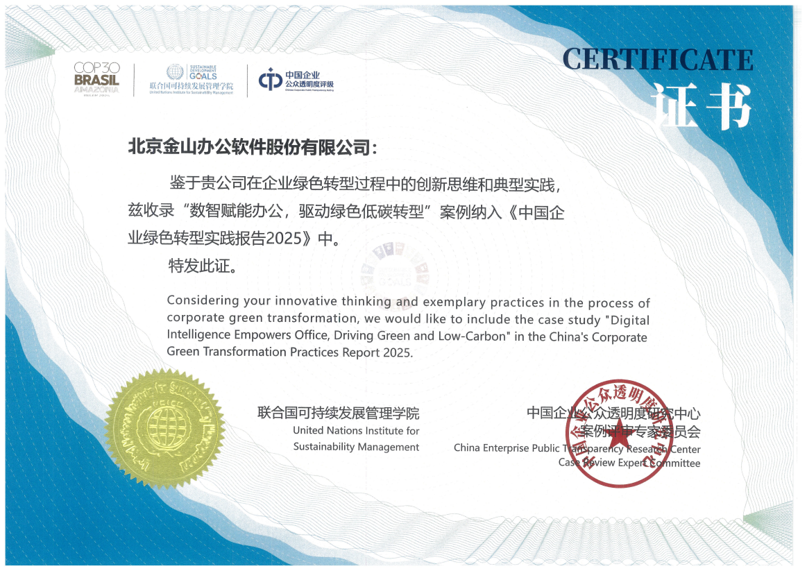 在实践成果方面,金山办公近期连获重磅认可:当地时间11月15日,在巴西贝伦市举办的《联合国气候变化框架公约》第三十次缔约方大会(COP30)中国角“低碳技术创新与产业实践”主题边会上,公司以“数智赋能办公,驱动绿色低碳转型(Digital Intelligence Empowers Office, Driving Green and Low-Carbon Transformation)”为题的案例,成功入选《中国企业绿色转型实践报告》。该报告由生态环境部应对气候变化司指导,中国环境科学研究院等四家机构联合主办,立足全球气候治理关键节点,以五大维度梳理中国企业绿色转型标杆实践,金山办公的数字技术赋能路径获国际层面肯定。