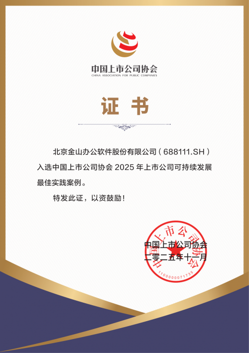 国内舞台上,金山办公再添殊荣:11月18日,由中国上市公司协会主办的2025上市公司可持续发展大会在京召开。经济合作与发展组织(OECD)、证监会上市公司监管司、相关自律组织、行业协会、500余位上市公司及境内外相关专业机构代表出席会议。在此次大会上,金山办公以“释放新质生产力动能 开辟企业数字化可持续航道”为题的实践,入选《中国上市公司可持续发展最佳实践案例2025》并受邀领奖。此次入选恰逢A股可持续信息披露规则持续完善的行业背景,彰显了监管机构与行业协会对公司可持续发展价值创造能力的认可。