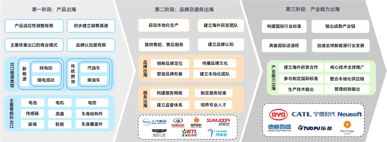 中国汽车出海不仅是一个产品的出海,也是产业链在全球化布局的整体突破。中国汽车出海进程大致分为三个阶段: