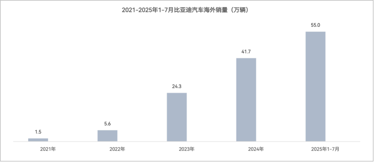 在技术研发端,比亚迪已在全球设立了11个研发中心,在电池技术、混动技术等领域持续创新,是全球率先同时拥有电池、电机、电控等新能源汽车全产业链核心技术的车企之一。截至2024年12月31日,研发人员超12万人,占员工总数33%,为技术创新提供了坚实的人才保障。与此同时,通过全球本地化布局,在亚洲、欧洲、美洲、非洲等地建设制造基地,这一布局不仅显著降低了地缘政治冲突与海运瓶颈对产能的冲击,更能贴近目标市场,实现快速灵活的本地化生产。在销售与服务端,比亚迪的销售与服务网络已覆盖全球112个国家和地区,拥有约700家经销商网点,并在全球主要市场设立服务中心或合作维修站点,定期开展培训活动,提高当地维修人员的专业技能和服务水平。2025年1-7月海外销量超55万辆,已超越2024年全年总和。
