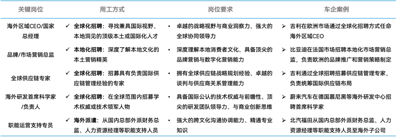 随着全球化战略升级,中国车企出海逐步转向更深层次的本土化运营模式。该模式下的海外人才布局则是“以本地化人才为核心的能力建设”,人才战略重心逐步转向本地化招聘,招募本地顶尖的管理人才和技术专家,赋予海外工厂运营与研发适配的核心职责,旨在利用其深厚的本地经验确保生产合规、质量稳定并开发出更符合区域市场的产品。