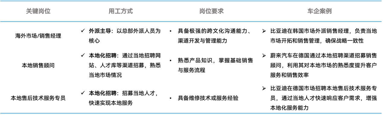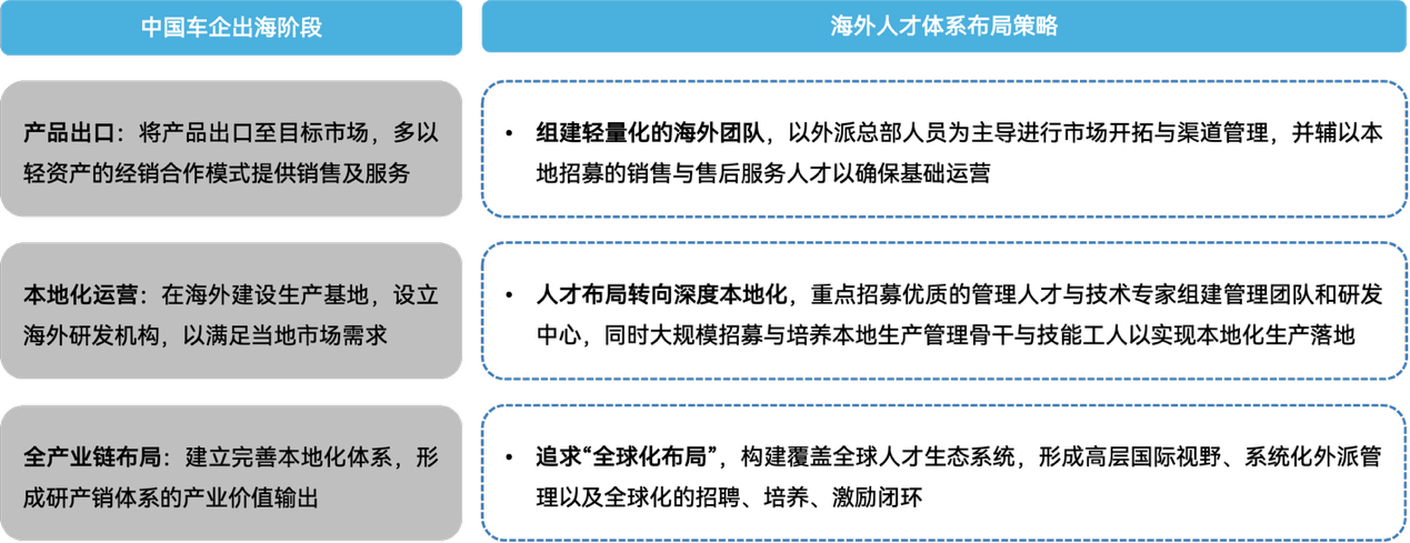 中国车企在出海初期以贸易型产品出口为主,核心目标在于快速开拓海外市场,建立销售服务网络。海外人才布局的核心是“以外派为主导的渠道开拓”,高度依赖总部外派的关键管理人员,建立和管控海外经销商网络。