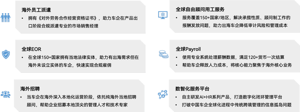 今元集团具备《对外劳务合作经营资格证书》,能够确保派遣流程合规合法。同时,旗下品牌金柚GEO为出海企业提供一站式全球人力资源解决方案,提供当地或全球范围内人才招聘服务,帮助企业更好地遵守当地的劳动法规,降低用工风险,为车企在海外市场的开拓奠定坚实基础。