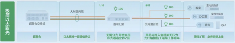 在湖南农业大学的数智校园建设中,教学办公区采用彩光超聚合方案实现教室万兆、办公室2.5G的带宽入室;宿舍区采用超融合方案覆盖566间宿舍,统一运维平台利旧保护投资,实现了“一张网”工程。