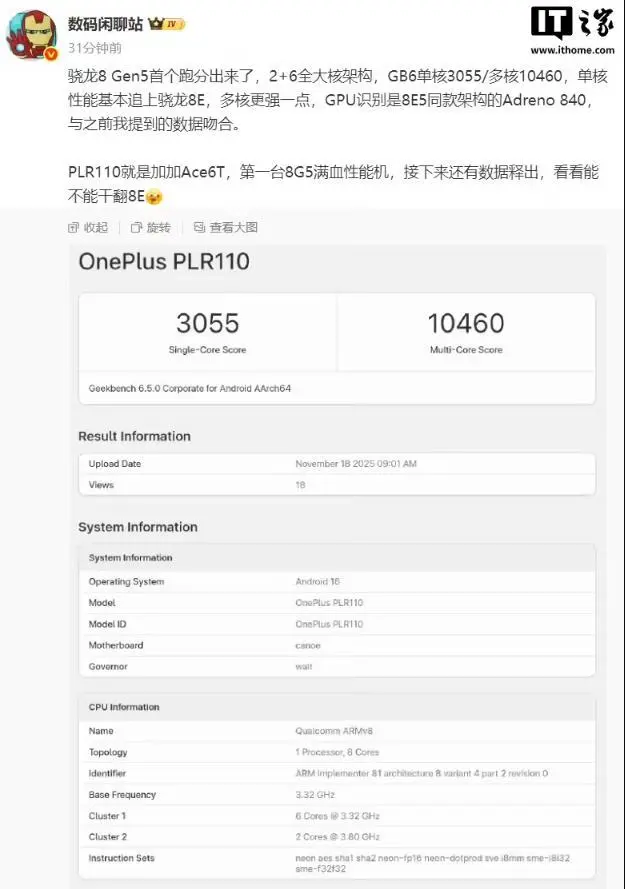 目前 Geekbench 平台已出现代号为 PLR110(疑似一加新机)的跑分数据,揭示了第五代骁龙 8 令人惊讶的性能表现: