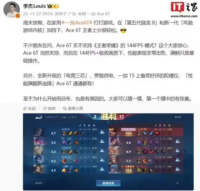 其次是游戏体验的突破,这款手机确认支持 165Hz 超高帧率,并已搞定某国民级手游(预计为《王者荣耀》)的 144FPS 模式首发适配。李杰更是放话:“满帧只是基础操作”。