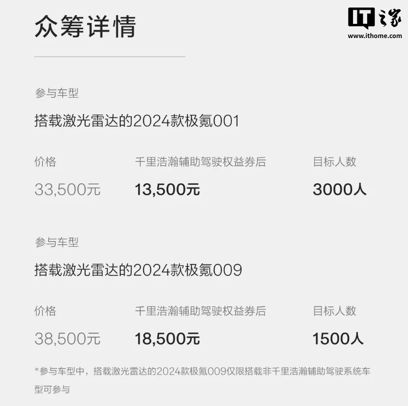 搭载激光雷达的 2024 款极氪 009 众筹价 3.85 万元,千里浩瀚辅助驾驶权益券后 1.85 万元,目标众筹人数 1500 人,仅限搭载非千里浩瀚辅助驾驶系统的车型参与。