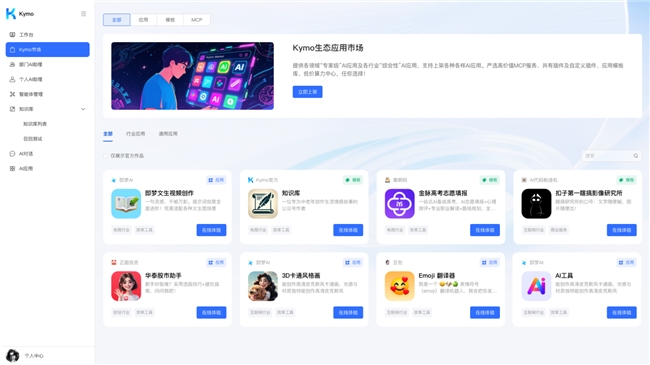 Kymo 通过 “应用反馈 - 数据优化 - 模型升级” 的闭环机制,让 AI 中台 “越用越聪明”,持续提升企业的创新能力。平台会自动沉淀应用执行数据与用户反馈,作为模型优化、场景拓展的依据;同时,Kymo 生态应用市场持续更新工具库、模型库与应用模板,企业可随时获取前沿 AI 能力,快速迭代现有应用或开发新场景。
